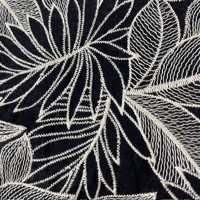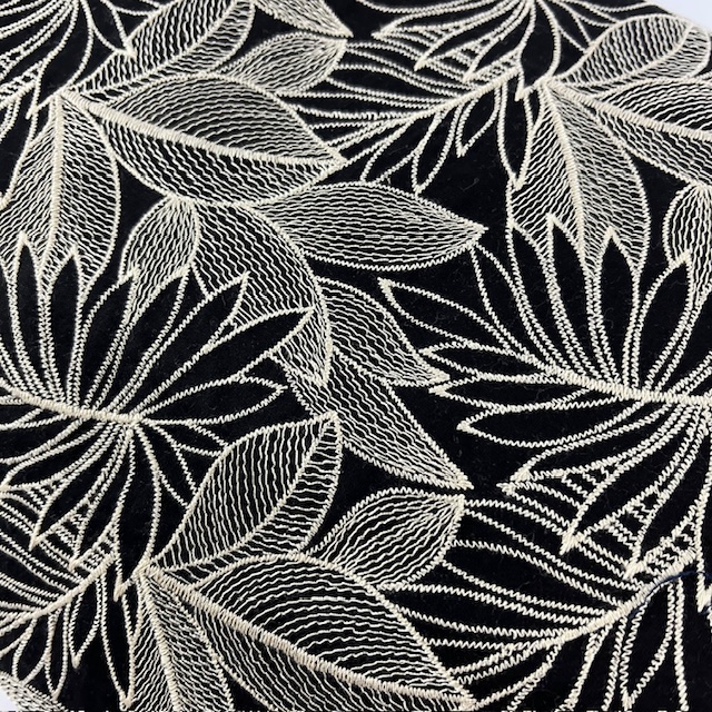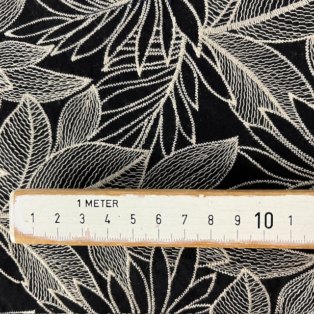 Ein schwarzes Gewebe aus Baumwolle bestickt mit Blättern in beige.